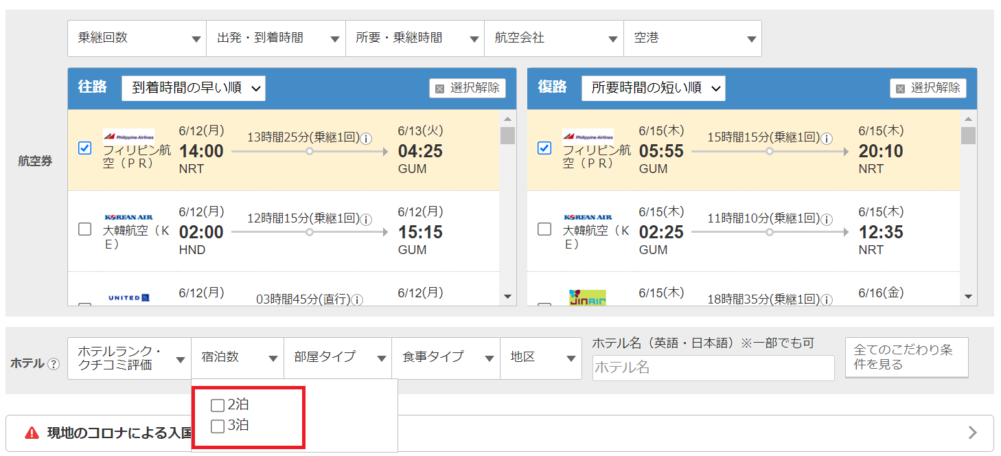 例)往路(日本出発日)6月12日~復路(現地出発日)6月15日で検索