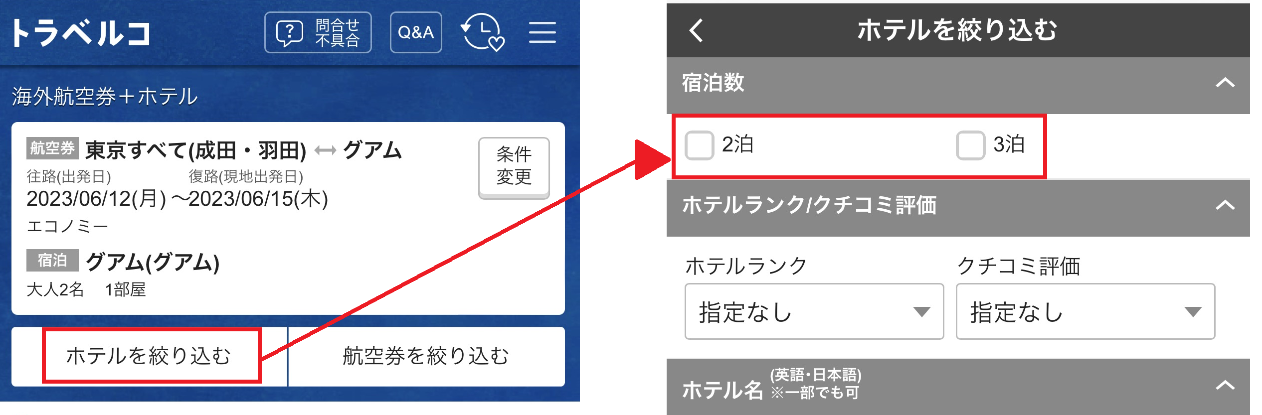検索結果一覧ページの「ホテルを絞り込む」機能より、宿泊日数を指定して検索していただくことが可能です。
