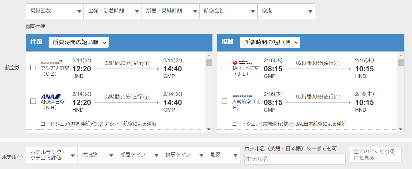 検索結果一覧では、フライトとホテルの2つの軸でさらに絞り込んで検索することができます。