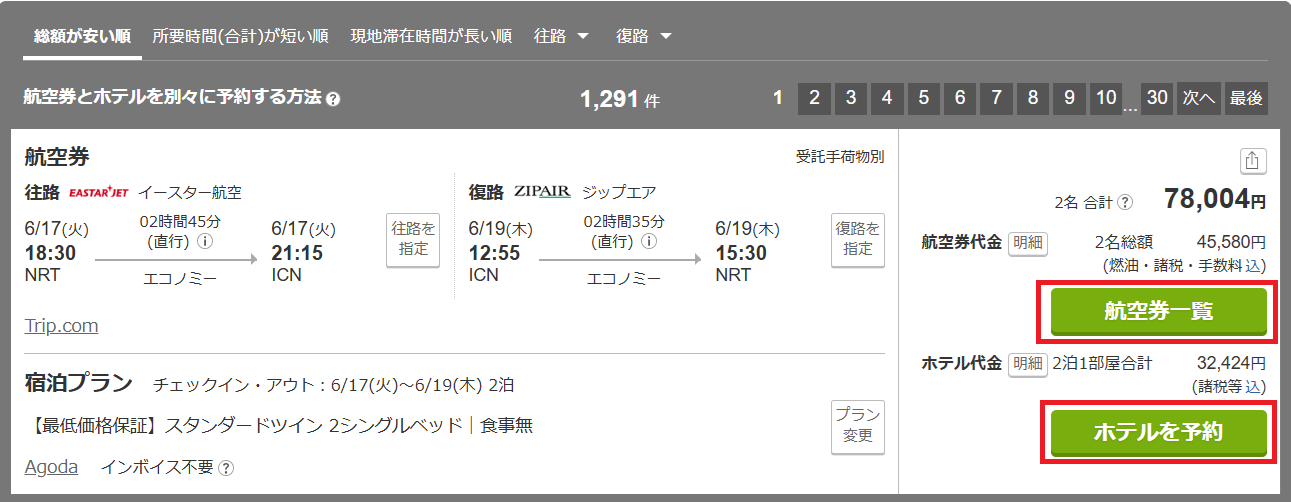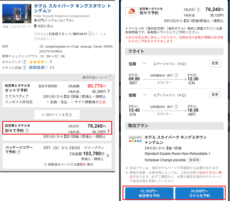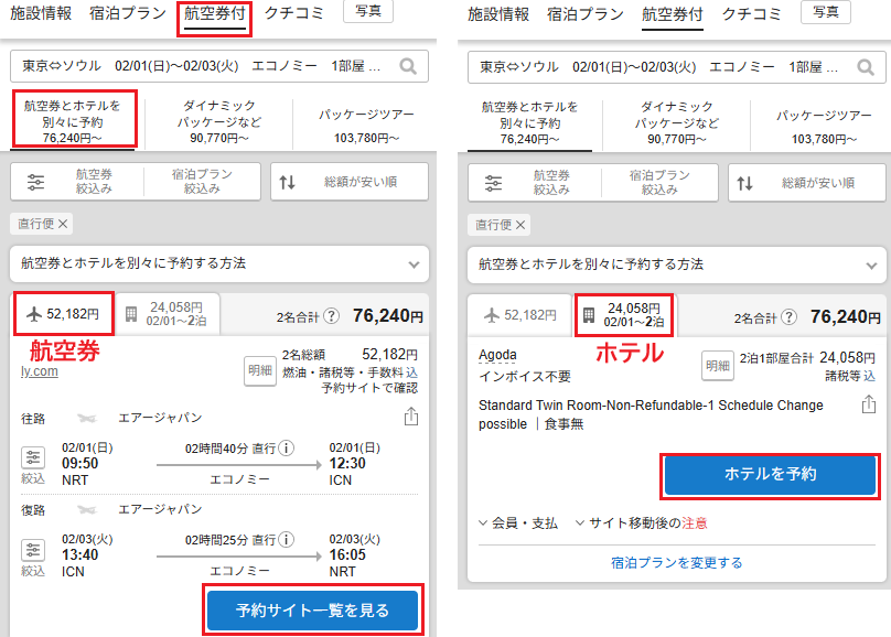 航空券とホテルを別々で予約する場合、それぞれのページで予約が必要です。