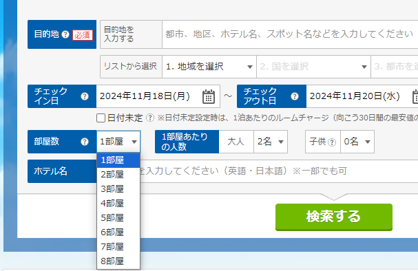 ただし、複数部屋を予約したい場合で、1部屋あたりの人数が異なるときは一度に検索することができません。
