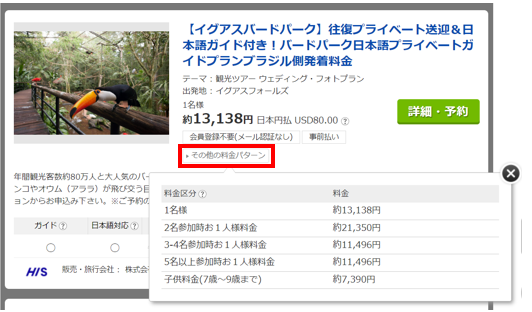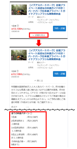 商品検索結果一覧ページの「詳細を見る」をタップすると、子供料金情報が下記のように表示されます。