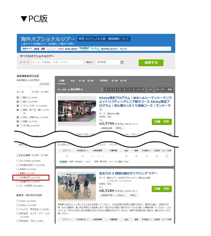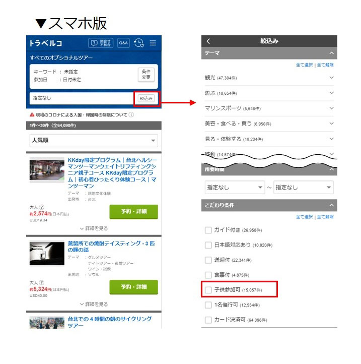 なお、子供の参加が可能な商品について、トラベルコ海外オプショナルツアーの一覧ページにある「こだわり条件」で、絞り込むことが可能です。
