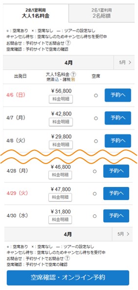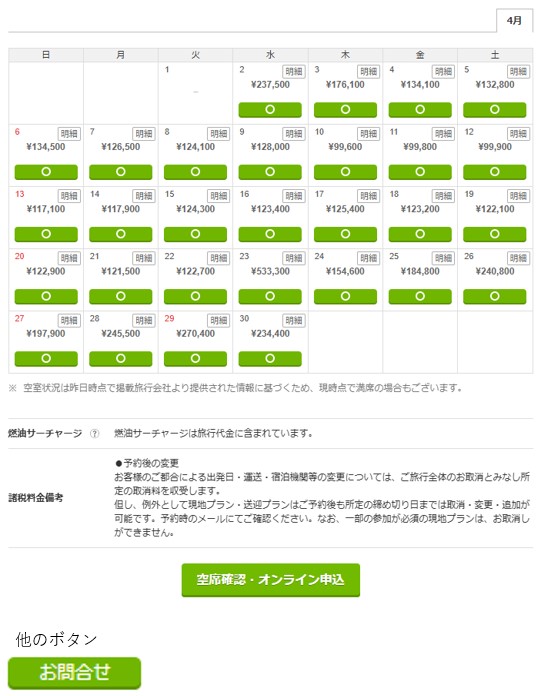 空席確認:旅行会社サイトで空席の確認が必要、もしくは旅行会社サイトでリクエスト・キャンセル待ちの出発日