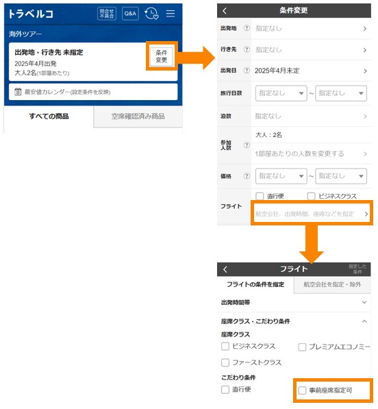 事前座席指定をご希望の場合は、ツアー検索時に「事前座席指定可」を選択していただくと、事前に座席指定ができる旅行商品一覧が表示されます。