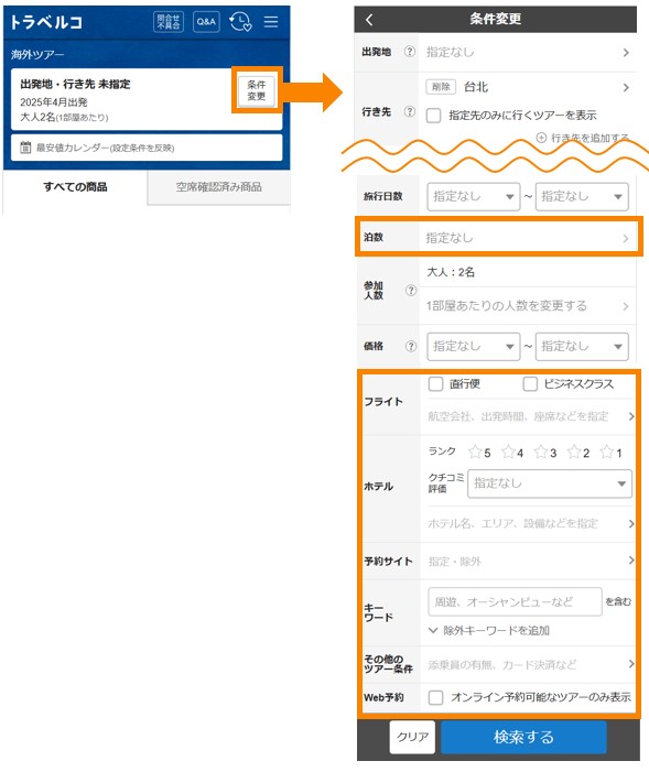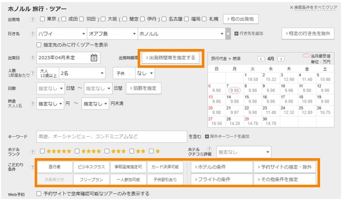 海外ツアー検索結果一覧ページより、泊数や出発時間帯・航空会社・直行便・ビジネスクラス・ホテルなど、より詳細な検索条件を設定することができます。