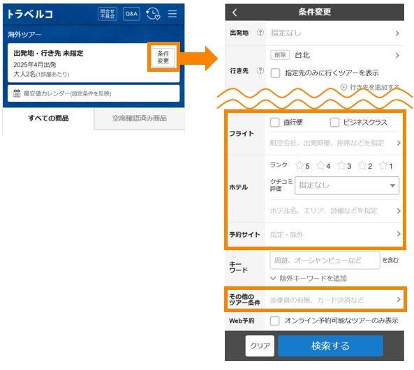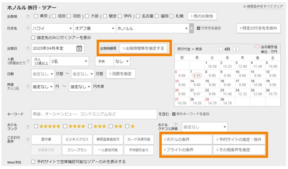 ホテル、航空会社、旅行会社の指定や除外など、ツアーに関する詳細な条件を設定して検索することはできますか?