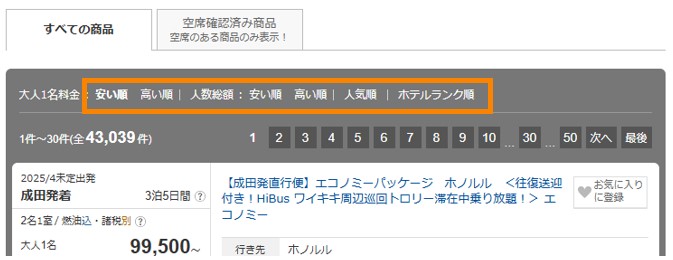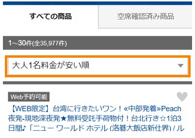・大人1名料金[安い順・高い順]:大人1名あたりの料金(旅行代金+燃油サーチャージ)で商品を並び替えることができます。