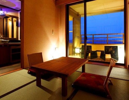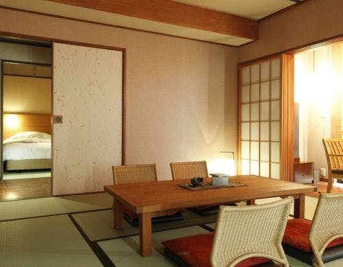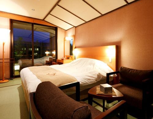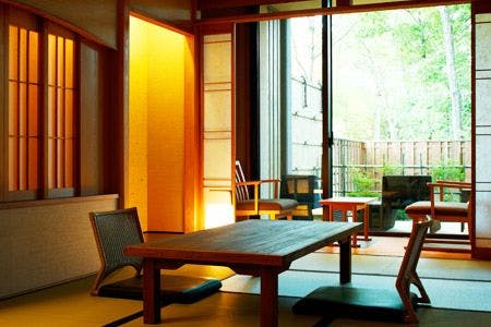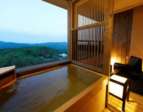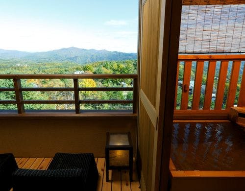 湯畑より少し離れた閑静な高台に佇む、全客室温泉露天風呂付きの宿。ご夕食は旬の食材をふんだんに使った月替りの会席料理。