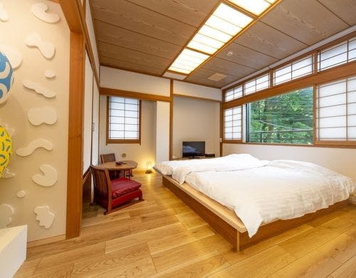 <源泉かけ流しの無料貸切風呂>四万ブルーの奥四万湖に近い7室の小さな料理宿。山や川に囲まれて静かにお過ごしいただけます。
