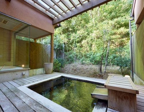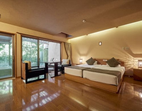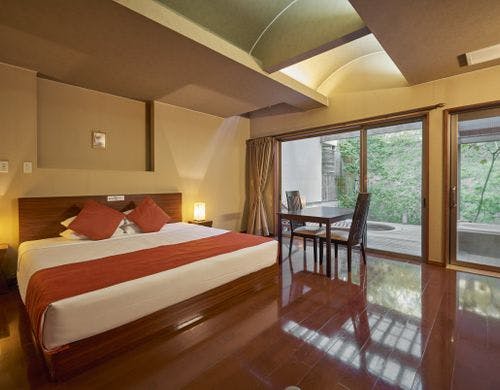コテージタイプの15のお部屋は全室露天風呂とジャグジー付きで、室内インテリアはリゾートテイストな大人の空間です。