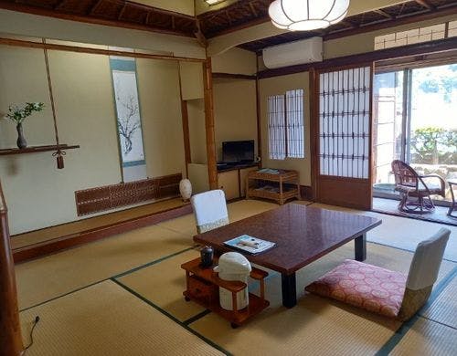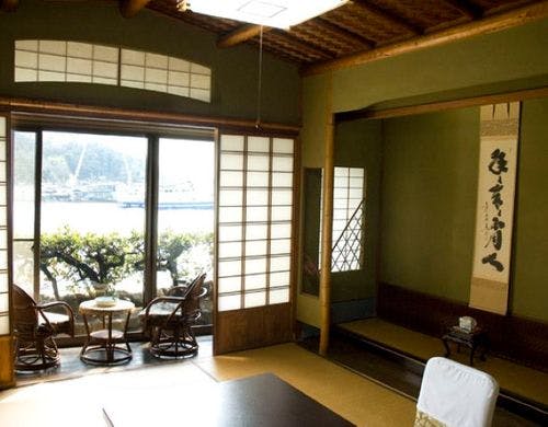 明治35年創業。国の登録有形文化財です。客室の外はすぐ海。瀬戸内海の魚貝を使った懐石料理が自慢です。「東京物語」縁の宿。