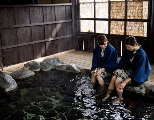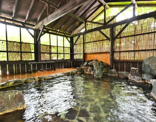 pH8.5の全国屈指の美肌の湯。源泉掛け流しの温泉をいつでもお楽しみいただける半露天風呂付きの客室もございます。
