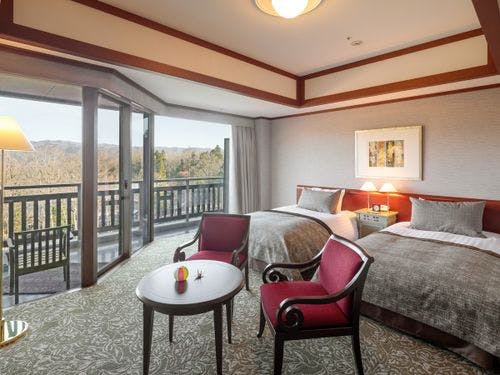 白馬山麓に佇む正統派山岳リゾートホテル。広い客室と露天付温泉大浴場、アロマセラピー、EV充電などあり。送迎可。