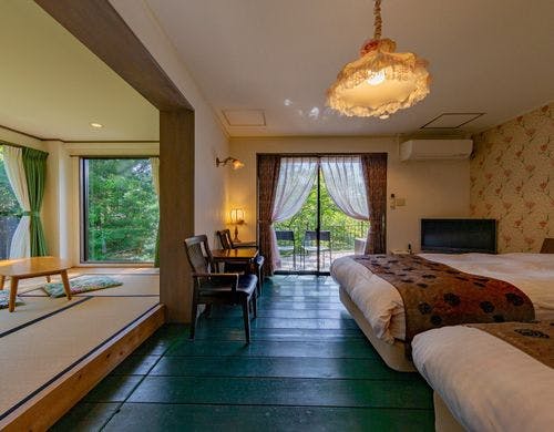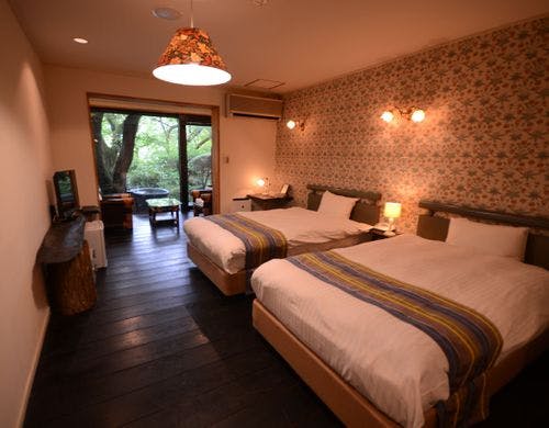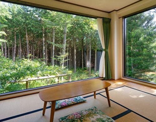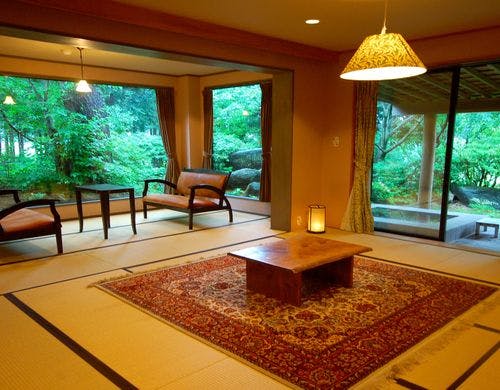 <森に溶け込む露天風呂付き客室>と<空に包まれた露天風呂>で四季を感じる旅を。全6室の客室露天風呂で癒しの時間をご堪能。