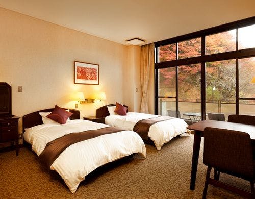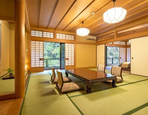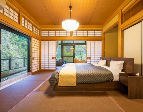 東京から車で約90分の立地。渓谷と庭園の美しい緑に囲まれた『美と食で心癒される温泉宿』