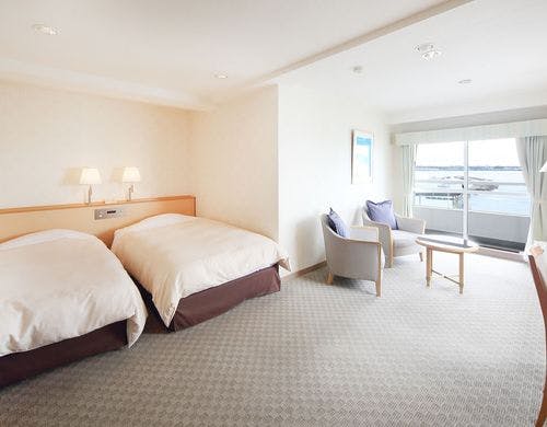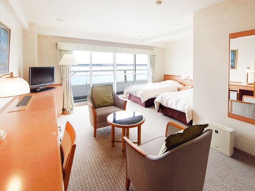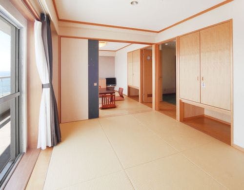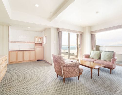 相模湾越しに富士山、伊豆半島、伊豆の大島を臨む眺望抜群のロケーション。展望風呂より海に沈む夕日が一望!