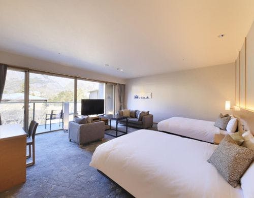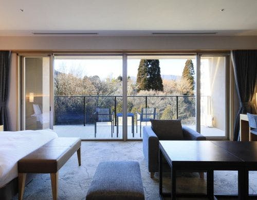 - 強羅駅から施設めぐりバスで30分、タクシーで15分、有料送迎有小田原駅発