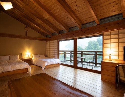 生命の河「仁淀ブルー」仁淀川上流域にある温泉宿泊施設。国道33号線一歩。森の環境に歩調を合わせ仁淀川町産の木造建築。
