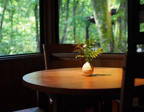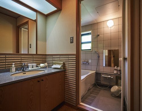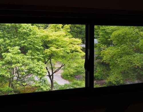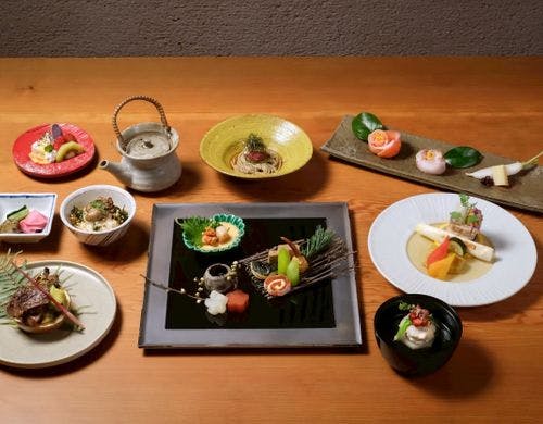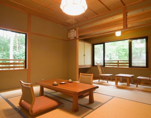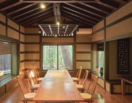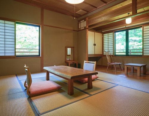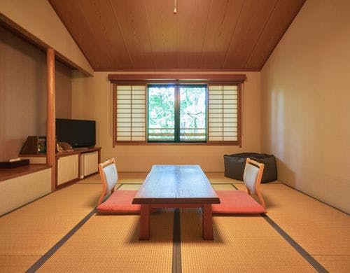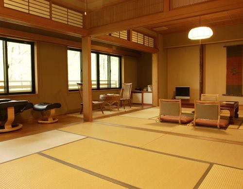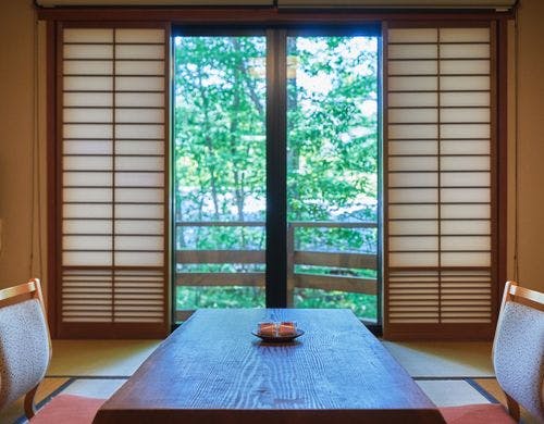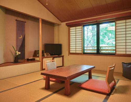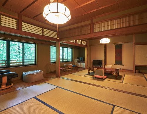 自然との調和に和みくつろぐ。雄大な自然と共生し、館内は細部まで木のぬくもりにこだわった静寂の空間で全ての場所から緑豊かな林が眺められます。お食事はレトロモダンな食事処で旬の創作懐石料理を楽しめます。