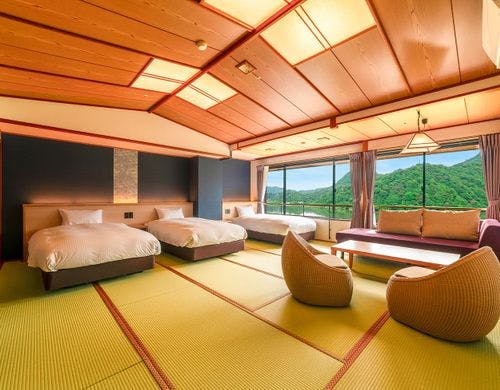 プレミアムラウンジで贅沢な時間を満喫。くつろぎの和モダン温泉宿