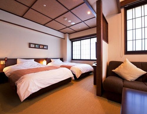 渡月橋まで徒歩約5分!目の前の阪急嵐山駅より京都の中心街まですぐ!天然温泉&5つの貸切風呂が無料で利用できる和風ホテル!