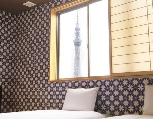 <スカイツリーを望む隅田川沿いの和のホテル>全室畳敷きなので素足で過ごせます。また、9F展望ラウンジからはスカイツリーと隅田川が一望できます。