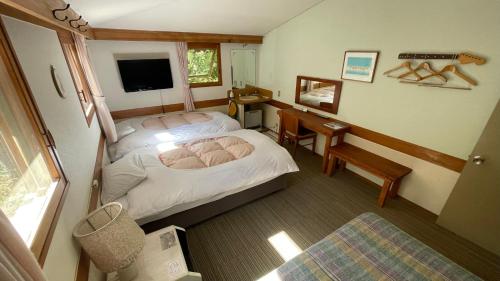 乗鞍高原の宿テンガロンハットB&BTengallonhatのお部屋にはデスク、薄型テレビ、共用バスルーム、ベッドリネン、タオルが備わります。それぞれのお部屋に冷蔵庫が備わります。