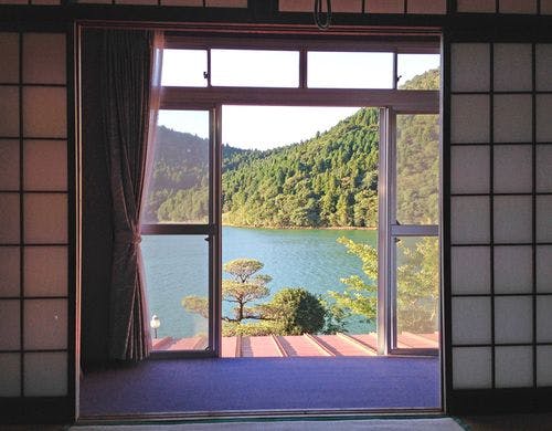 客室の窓からはおしどり池を一望できます。落ち着いた雰囲気でゆっくりお寛ぎください。
