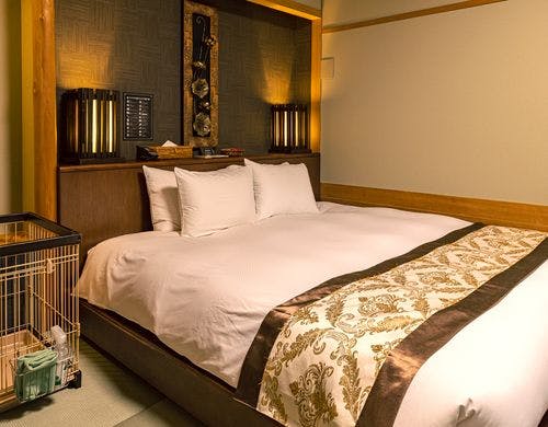 伊豆高原の竹林の中に佇む「ウブドの森 伊豆高原」は、バリの異国情緒と和の風情が融合した愛犬と泊まれるラグジュアリーな温泉リゾートです。愛犬との素敵なひとときを過ごせるように屋内外にドッグランがあり、セルフグルーミングサロンや専用アメニティなど、ワンちゃん用の施設やサービスが充実しています。さらに伊豆の旬鮮素材と季節の旬な食材を使った料理は、愛犬にも伊豆の味覚が楽しめるように塩分や糖分は使用せず調理した愛犬用のビュッフェも用意されています。伊豆高原駅から車で約10分。