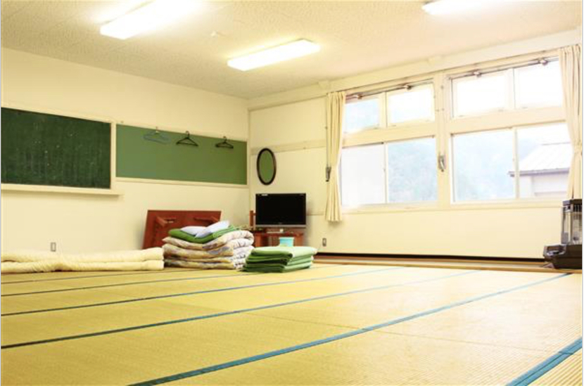 標高750mの山に囲まれた音のない自然の世界へようこそ。村唯一の小学校が宿泊施設になりました。