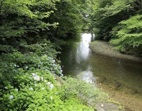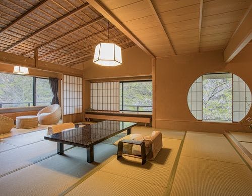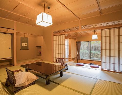 熱海荘は、自然に抱かれる静寂の宿です。畳の香りが心地よい数寄屋造りのお部屋では、風の葉鳴りや川の瀬音にこころ癒されます。奥深く穏やかな自然を眺めながら、ゆったりとしたひとときをお過ごし下さい。
