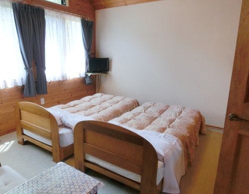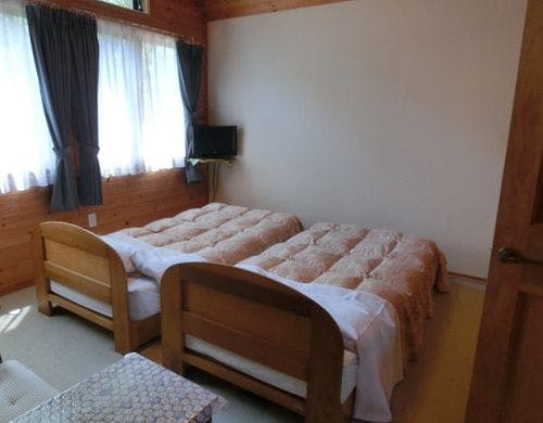 ログハウスの素敵なペンションです。木の温もりに包まれた、5つの部屋と3つの浴槽もあり雰囲気抜群