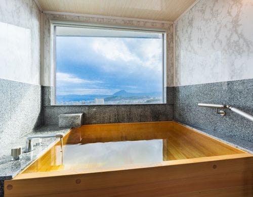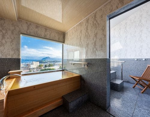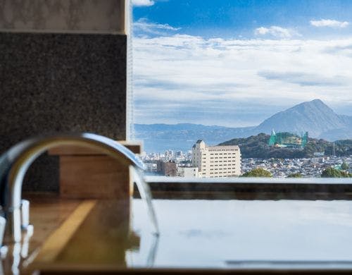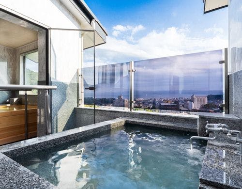 全室源泉掛流しの天然温泉付♪ 高台にそびえる宙(sora)から眺める別府は一見の価値あり。