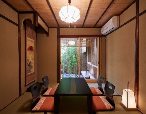 京町家の特徴である吹き抜けを修復した高窓からは柔らかな陽射しが降り注いでいます。ゆったりとした京時間をお楽しみください。