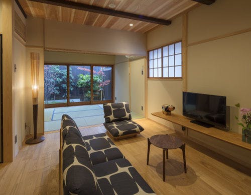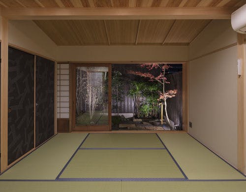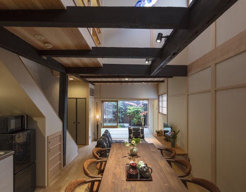 【隠れ家風プライベート空間。一棟貸し切り京都町家】「京都駅」2駅。嵐山まで電車一本。大きな坪庭を望む広々町家