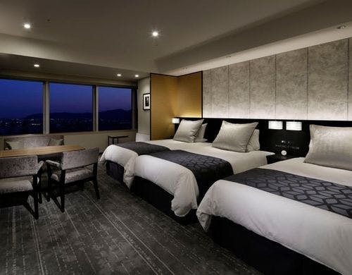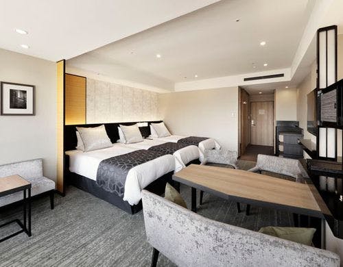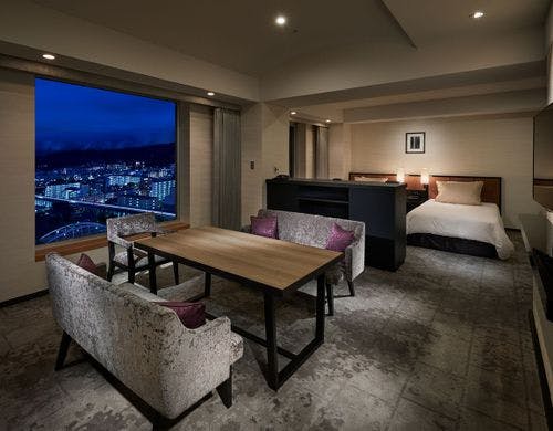 客室の特徴京都駅上にある客室では、静かで落ち着いた空間が広がっており、旅の疲れを癒やすのに最適です。スタンダードからスイート、京都の山並みを望める大窓つきの部屋など、全21種類の多様なタイプを用意し、2名から5名まで対応可能です。家族旅行やビジネス利用など、さまざまなニーズに応じた滞在が可能です。