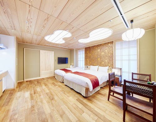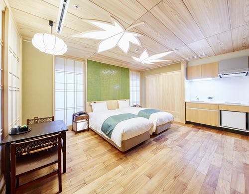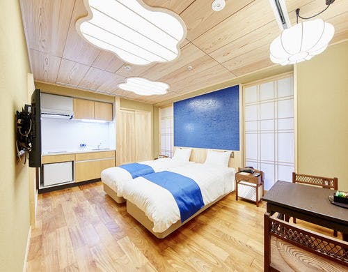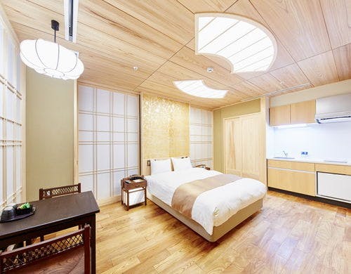 京に包まれた和ホテル「SUNRISE SUITES KYOTO サンライズスイーツ京都」。伝統的な和のモチーフを施した全15室の客室をはじめ、日本庭園空間を楽しめる京都らしい魅力が詰まったホテルです。洗濯乾燥機とキッチンを各客室に完備し、短期、長期どちらの滞在も快適に過ごせます。世界遺産である東寺の五重塔も目の前に位置しているほか、京都水族館、京都駅も徒歩圏内で観光拠点としても便利です。東寺駅から徒歩約5分。