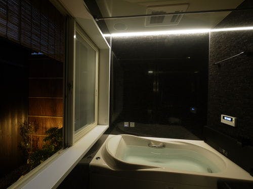 欄干窓から間近に見上げる京都タワー。伝統的な佇まいと最新の設備が融合する一棟貸しの京町家。