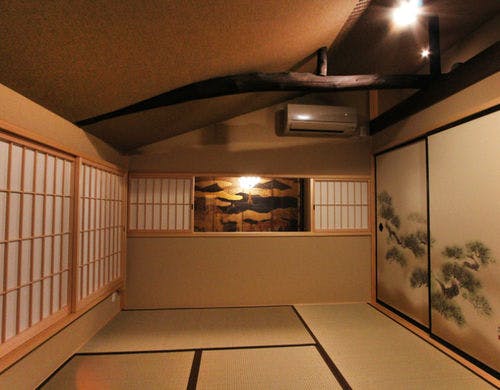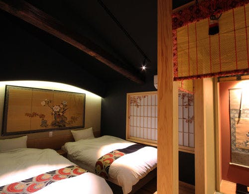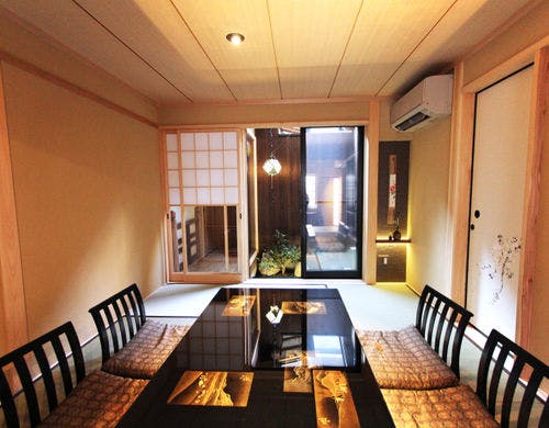 京都の花街すぐ近くの「京町家ゑびす」。築130年以上の京町家が生まれ変わった一棟貸しの宿です。こだわりが随所に見られる玄関、浜高悦郎作の輪島塗座卓を配した和室には京町屋の風情が感じられ、湯船や和室の雪見障子から白砂の坪庭を眺めることもできます。一方で、現代設備で季節を問わず快適に過ごすことができるよう全室に冷暖房を完備しているほか、1階の居室には床暖房、和室には堀りこたつ、寝室にはシモンズ製のベッドを設置しています。祇園四条駅より徒歩約3分、建仁寺や祇園花見小路、六波羅蜜寺のすぐそばです。