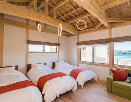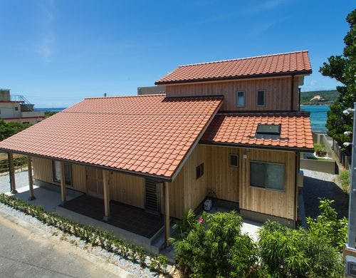 ビーチまで徒歩1分!木の温もりを感じるモダン琉球建築の別邸を一棟貸切。寝室からは伊計島の透明な海が見渡せます。また、BBQブース(道具など)、ピザ釜、シュノーケルグッズなども無料です