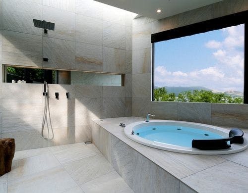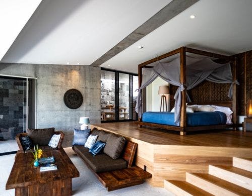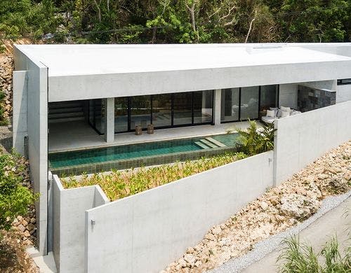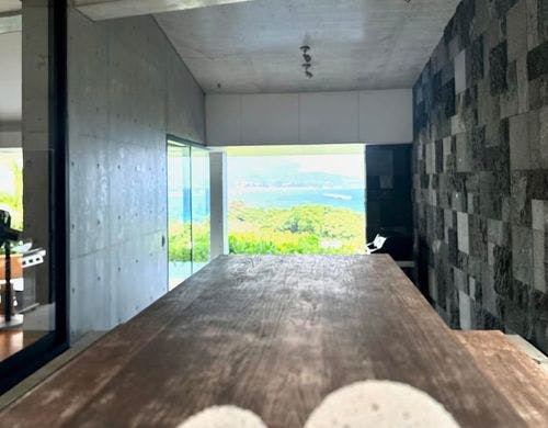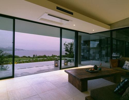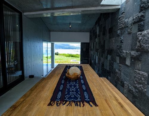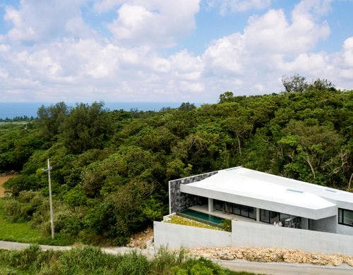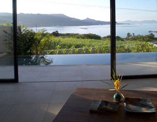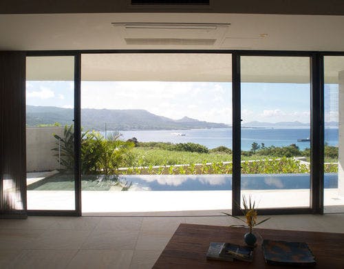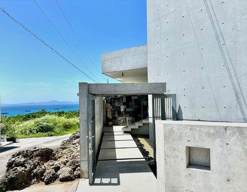 沖縄 瀬底島橋で行ける小さな離島には、沖縄らしい景色が広がるサトウキビ畑の中に、ひっそりと建つ豪邸コバルトブルーの海が広がり開放感のあるリビングスペースには、海風が心地よく吹き込む