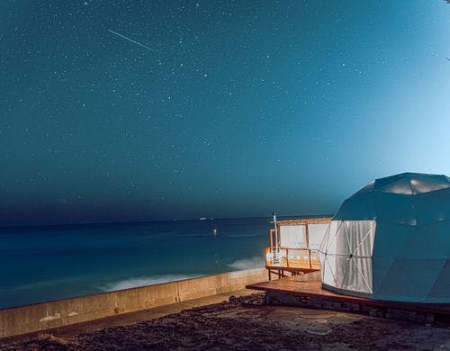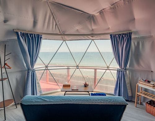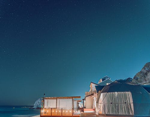 13,800円~ )水平線から昇る朝日を臨む温浴施設併設のグランピング施設。