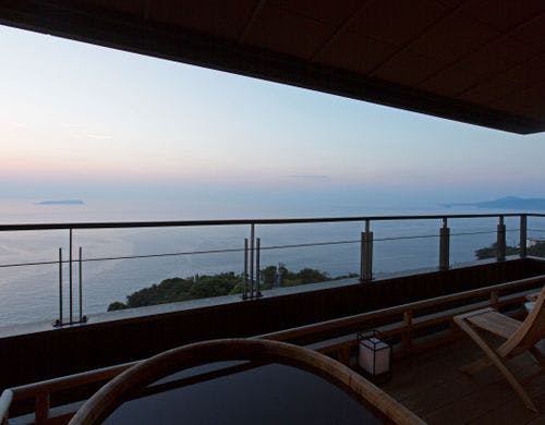 海一望の絶景、熱海の奥座敷を満喫できる瀟洒な宿です。7室しかなく全室温泉露天風呂付。貴賓館は専用の御食事の御部屋を御用意。他の御客様と会う事は一切無い、相模湾一望の大人のおこもり隠れ宿です。