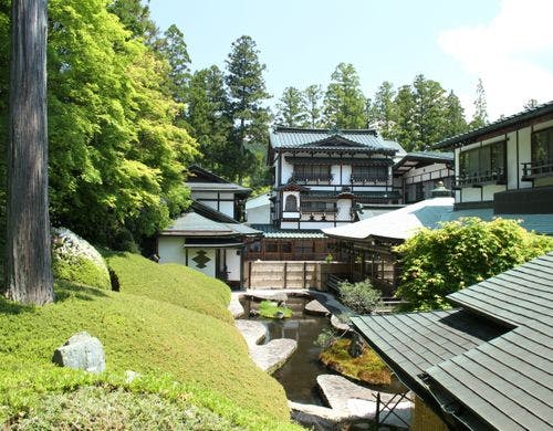 高野山唯一の天然温泉と露天風呂がある高野山最大の宿坊です。名作作家・重森三玲による3つのモダンな庭園もお楽しみください。