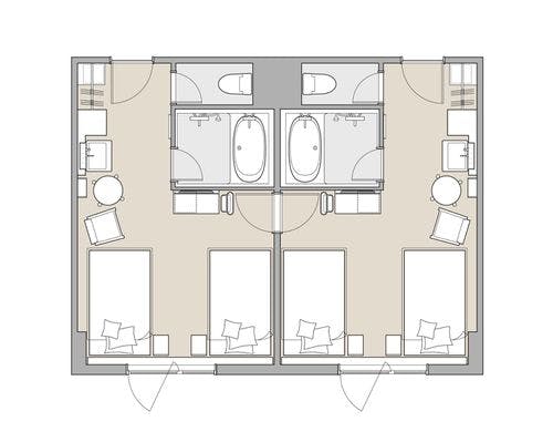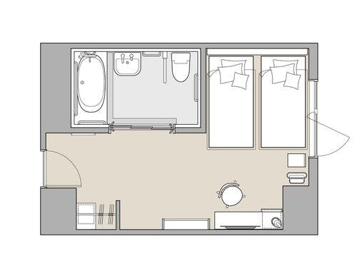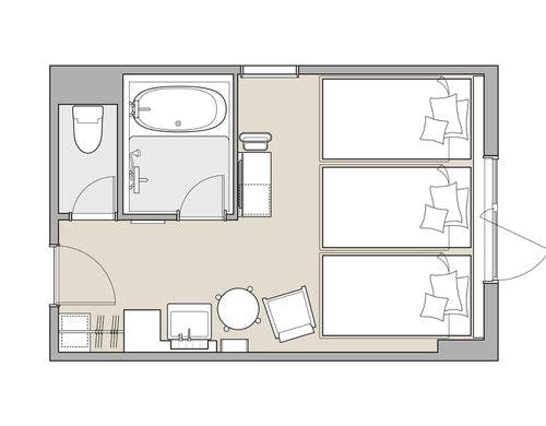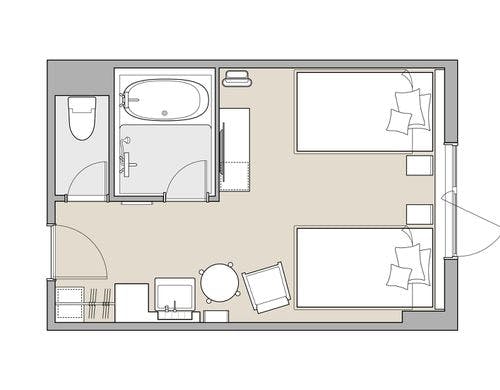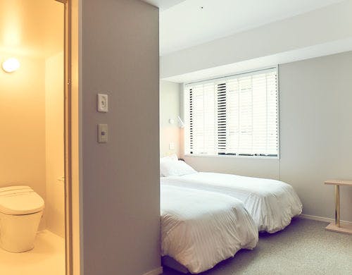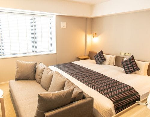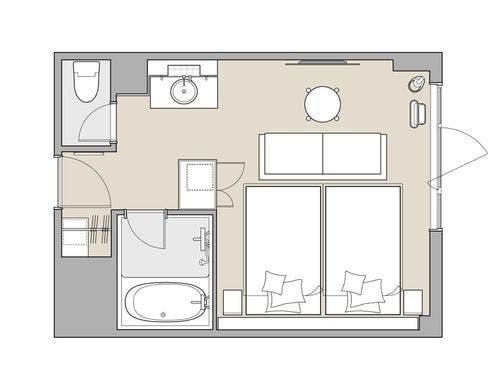生成りホワイトと木の温もりを活かしたミニマルなデザインの客室には、hotel it.オリジナルファブリックがアクセントになっています。ダブル、ツインに加え、コネクティングルームやユニバーサルルームなど、多様なタイプを揃え、独立したバスルームや広々としたベッドで快適な滞在を提供します。