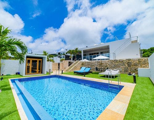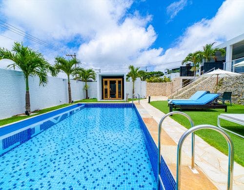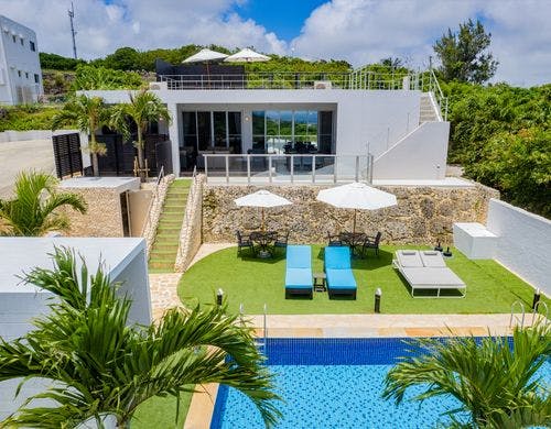 開放的なテラスから宮古ブルーに輝く海と満天の星空を望むロケーション