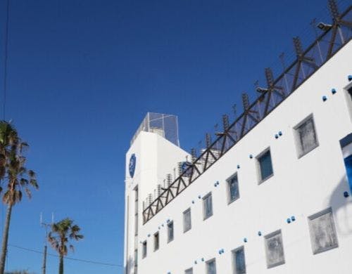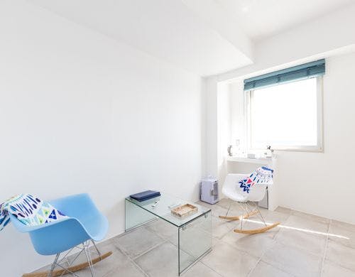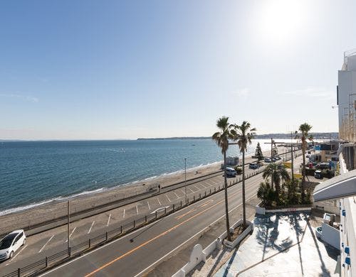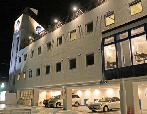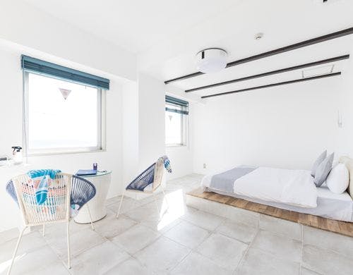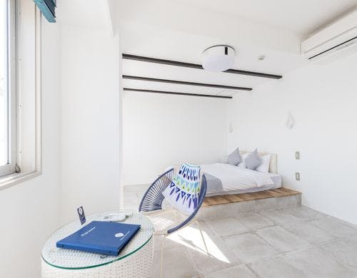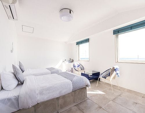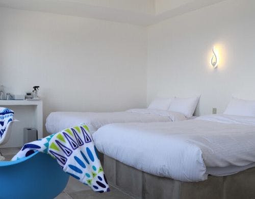 エーゲ海のホテルを彷彿とさせる白とブルーが基調の全館漆喰塗りオーシャンビューリゾートホテル。