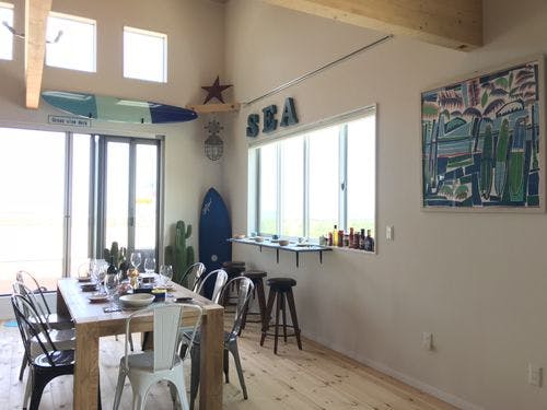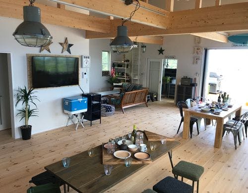 カリフォルニアの別荘をイメージした、優雅な時間を過ごせる施設。バルコニーに繋がるキッチンに60平米のリビング、2ベッドルーム(ベッド全6台+布団)シアターやジャグジーも無料でご利用OKです。