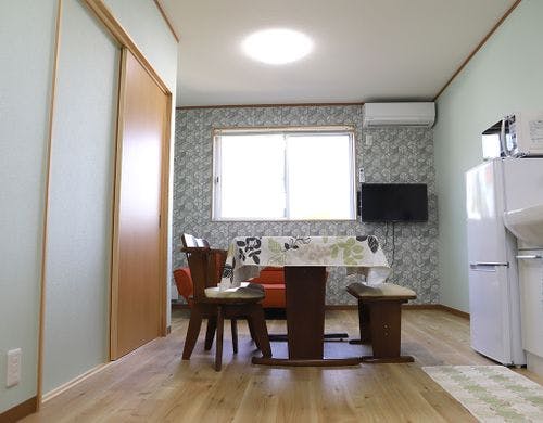 コテージルームは、1階はリビング、2階は寝室となっており、洗濯機やキッチン設備あり、清掃のない別荘に来た感覚で利用可